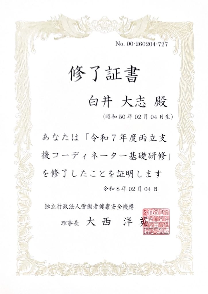 全課程を修了しましたが、ここがゴールではなく、あくまで支援者としてのスタートラインです。 「病気になっても働きたい人」と「それを支える企業」。 その両方の力になれるよう、一つひとつのご相談に誠実に向き合ってまいります。